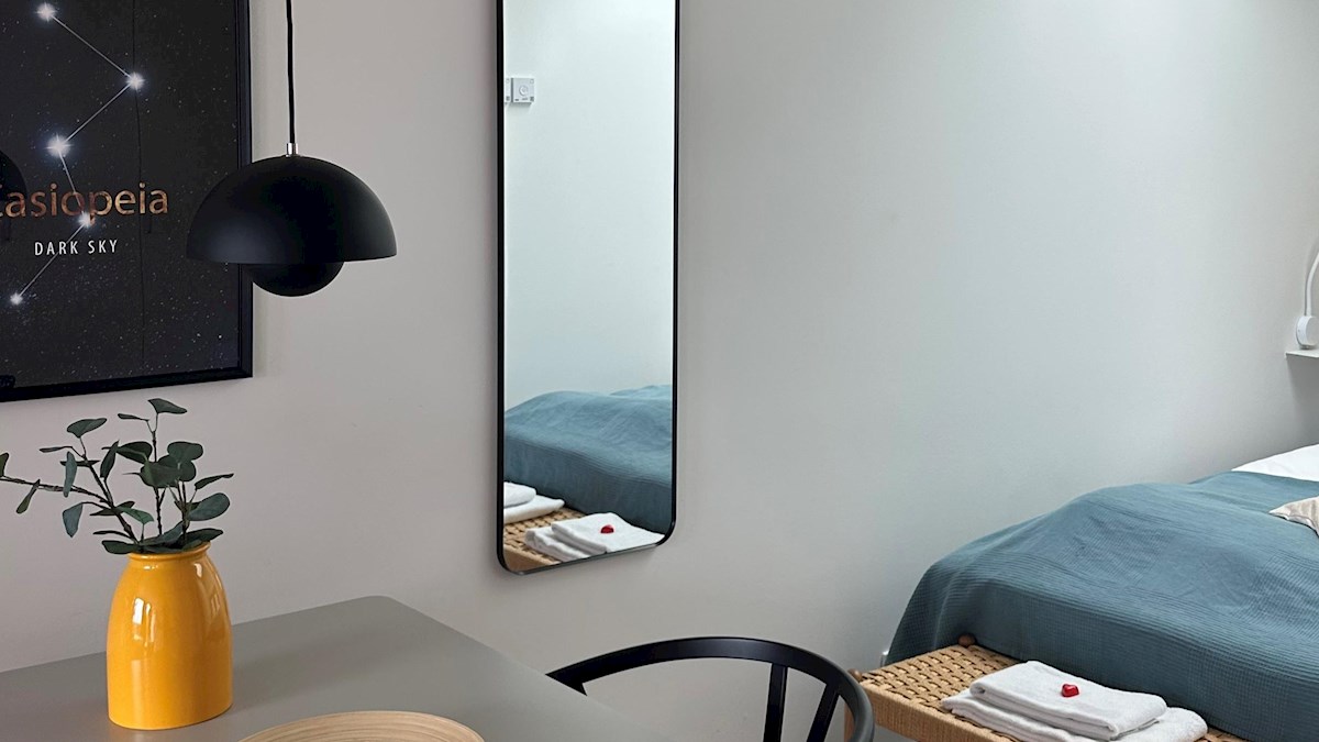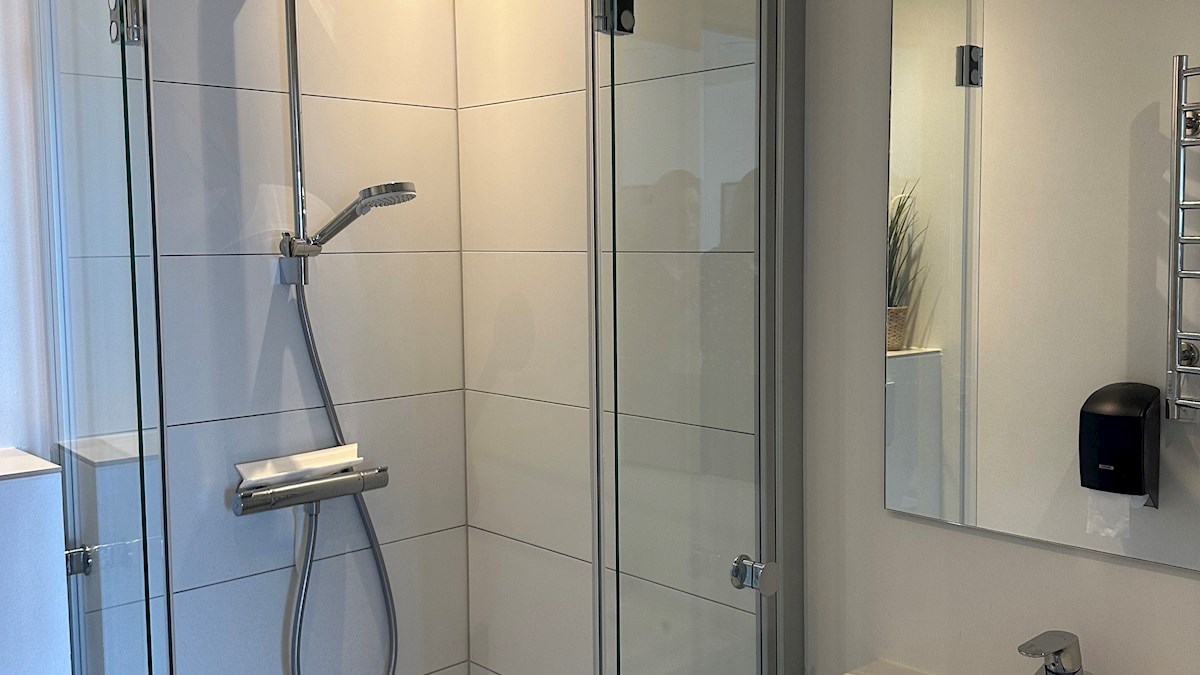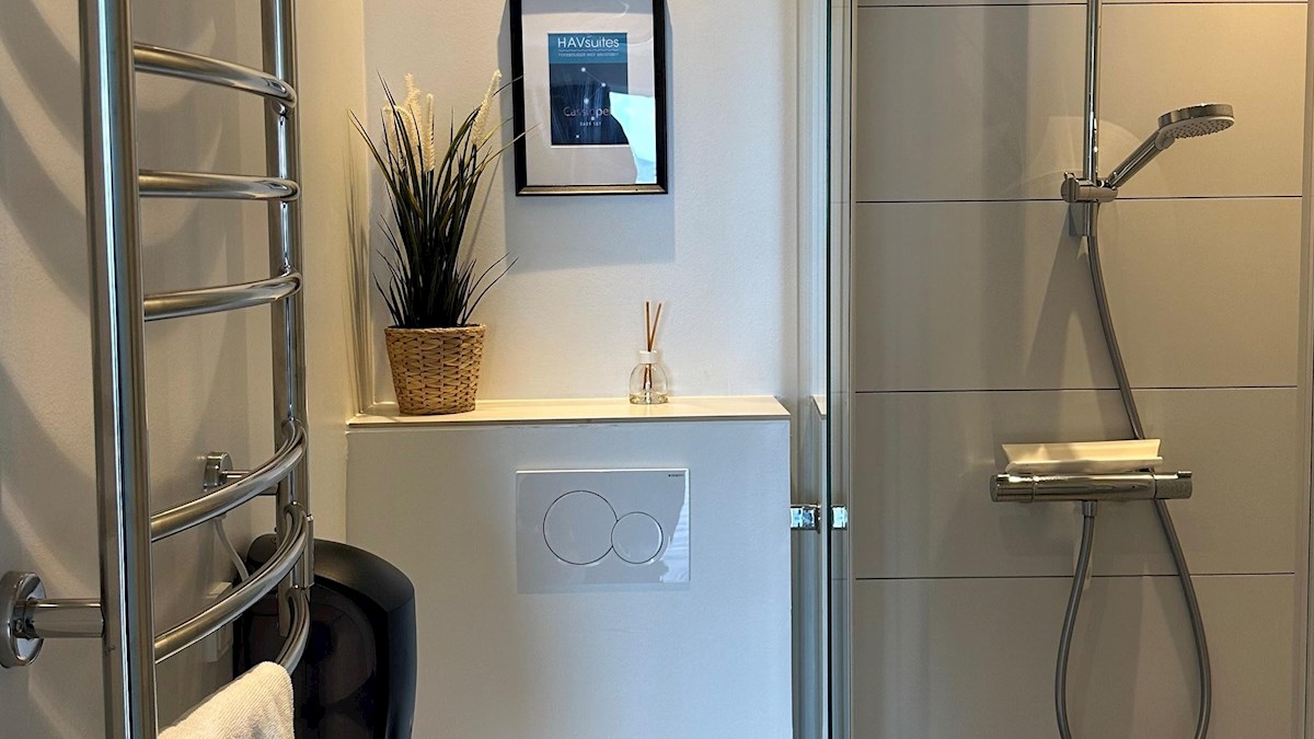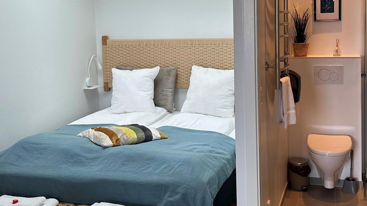 HAVsuite Superior er forsynet med et stort ovenlysvindue over den opredte dobbeltseng, der giver udsigt til stjernerne – det kalder vi Dark Sky. Fra sengen kan du også opleve havudsigten til Kattegat, Samsø og Tunø. Suiten er indrettet med eget badeværelse og funktionelt køkken.