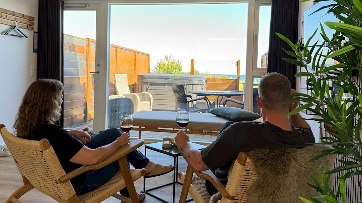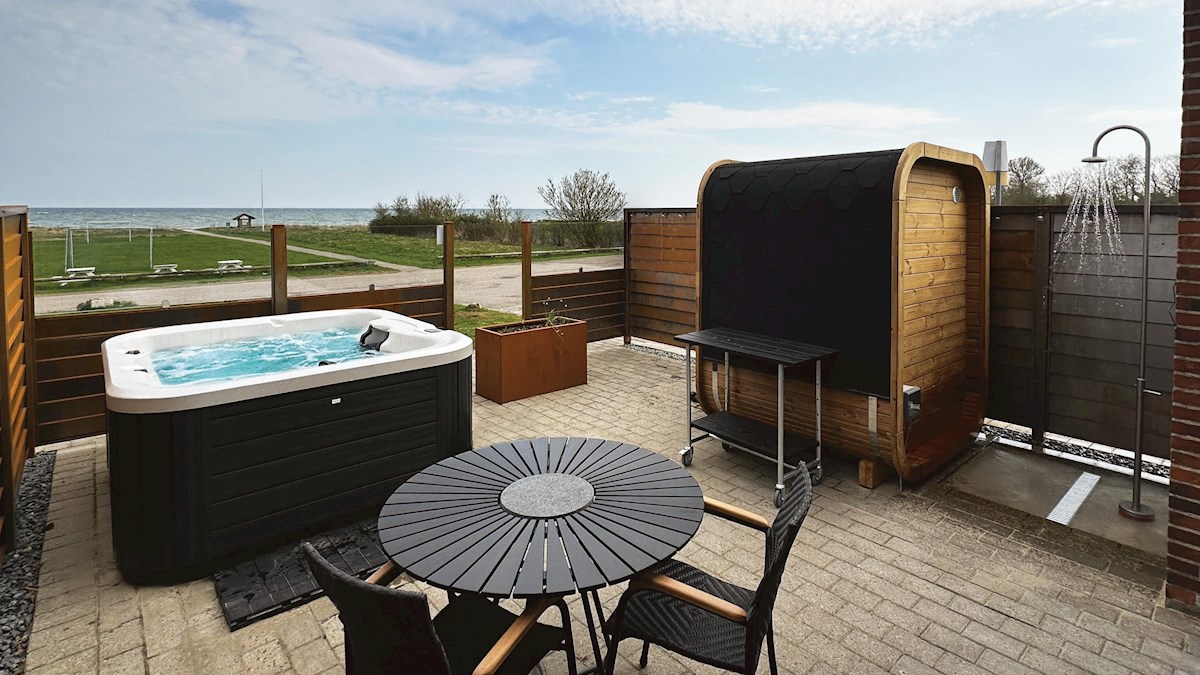 På terrassen er der liggespa, udebruser og egen sauna . Det vil sige, at spaen er så stor at man kan ligge udstragt og nyde havudsigten i fulde drag.