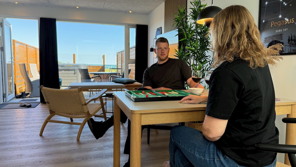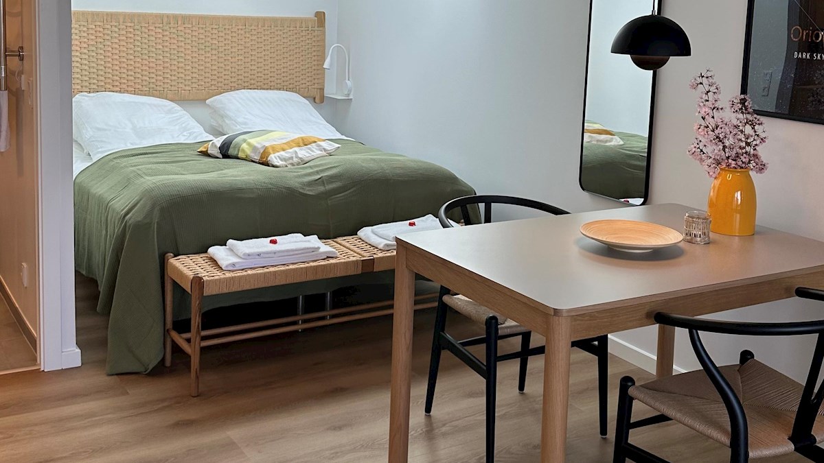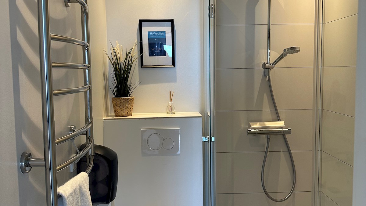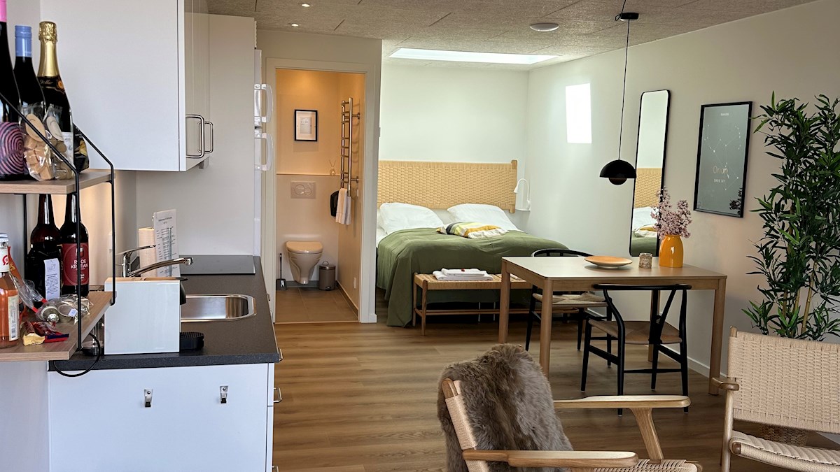 The three HAVsuites Prima are equipped with a large skylight above the made-up double bed, which provides a view of the stars – we call that Dark Sky. From the bed you can also experience the sea view of Kattegat, Samsø and Tunø. The suite is furnished with a private bathroom and functional kitchen.
